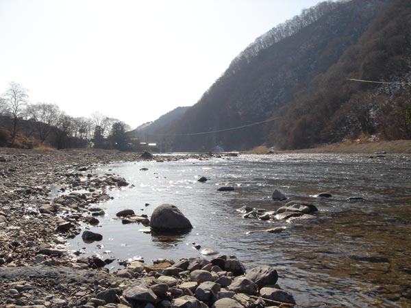 するとなんと、大きな川でした。朝の肌寒い中川の音を聞いてると、遠くに来たなという気になるね。 みんなはどんな時に「ああ旅行にきたな〜」と思うのだろう。俺はこういう川の音聞くと思うんだよね。 |