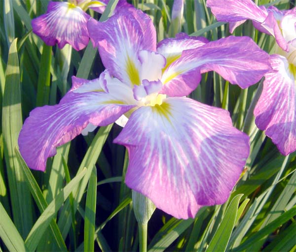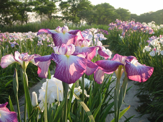 菖蒲(アヤメ)。 バラみたいに色とりどりで、ビックリ。全体的には淡い色が多いみたい。花びらがテロテロしてて時代劇の背景に良く似合いそうな風情を感じました。 |