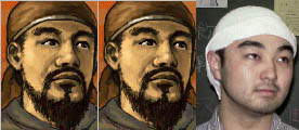ゲームメーカーコーエイのソフト、「三国志7」?(6かも。。)にでてくる武将の顔にとてもそっくりな人がいまして、あまりに似てるから同じような角度、同じように頭に頭巾をかぶってもらって比較してみました。