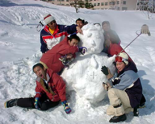 作業着にすばやく着替えて、雪合戦。それから雪だるま。