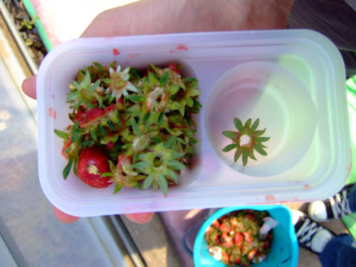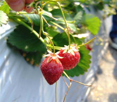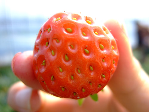 イチゴ狩りへ行く 05/04/06 ![]() 俺はかなりのフルーツ好きです。 小さい頃は野菜がキライ(これは今は大分克服) 魚介類が嫌い(これは深刻に、今でも焼き魚以外はほとんど食べたくない) という事からか食べたいと思うものが少なく、フルーツはそんな食後の楽しみでした。 特に好きなフルーツは、イチゴ、梨、スイカ、桃、デコポンの五つです。 その中でもイチゴは1番か2番に好きなんです。 家にイチゴがあるときはこっそり食べたりw 人の分まで頂いたりしています。 思えば小さい頃に一度だけ行ったイチゴ狩り。 ファミリー色強い行事かと思いきや、案外うちら位の方も〇〇狩りに出かけているみたいです。 先日木更津に行った時にイチゴ狩りも計画していたんだけど、マザー牧場でヒツジやブタとたわむれているうちに時間が無くなってしまい(泣 行けなかったんです。。 気を取り直して計画しまして、千葉県は九十九里海岸近くの成東へ行きました。 夜なら下道で2時間かからないんだけど、昼間は混んでるので仕方なく千葉北ICまで南下して高速道路を使いました。 成東はなにやら千葉県きってのイチゴの名産地らしく、成東駅周辺に来るとあちこちに「イチゴ狩り」の看板がありました。 なるほど、イチゴ町成東です。 30分狩り放題で1000円。 でも入り口にいるおばちゃんはかなりアバウトな方で、時間制限あるのに時計を持ってない。 しかもビニールハウスの何処にも時計が無い。 つまりは30分という尺度は自己申告制なわけです。 勢い良く食べ始めました。 大きくて真っ赤なやつを狙って食べていきました。確かに甘くておいしい。 無我夢中で食べつづけると、20個以上いったあたりからお腹に溜まってきます。 しかもおいしいけど、暖かいビニールハウス内にイチゴがあるので、ちとヌルイ。 普段食べているイチゴは冷蔵庫で冷やされた状態なので、想像と少し違う。 でもそんなビニールハウス内のイチゴの中にも冷たいのがあるんです。 なんだ?と思うと、ビニールハウスの端の方にあるイチゴ。もしくは葉っぱに隠れて下のほうにあるイチゴ。 名づけて「影イチゴ」 ![]() これだ!という気持ちになってそれまで狙っていたような上物にも目もくれず、葉っぱをかき分けて影イチゴを探しました。 食べているうちに右手の親指がヘタの取りすぎで少し痛くなってきました。 仕方なく左手に変えると、食べづらい。左利きなのに。 結局右手に戻り、ヘタをやんわり取りながら食べました。 いくつかはヘタが付いたままww もう一つ発見した事がありました。 あまりでかすぎない中くらいのイチゴのほうが甘い。 これは大発見ですよ。調子に乗って小さい物を食べるとネチャネチャしてて凹んだりしますけど。 でも、一度手で触った物は食べないといけません。 触ったら食べろ、食べないなら触るな。←飲んだら乗るな、飲まないなら乗れ?でしたっけ車の標語風に。 あまりにお腹がいっぱいになったので写真を撮りながら待っていると、一緒に入った別の組の方はもういません。 30分もうすぎてしまったのでしょうか? ていうか、30分もフルに食べつづけられませんね。 アバウトなおばちゃん恐るべし。 という事で、無事に食べまくりました。 ![]() 車に戻ってみると食べている間に痛かった右手の親指の爪に血豆が!!! なんかかっちょわるいなぁ。。イチゴの食べすぎで血豆なんて。。 どんだけ興奮して食べてたんだろう。。 えーさて感想文だとせっかく読んでくれた方に悪いので、おまけとして撮った写真で少しレポートしながら書いていきたいと思います。 まず気が付いたのは、イチゴの茎。 なんかワサビみたいな形をしています。 ![]() 次はイチゴの花です。 近くに赤くなる前のイチゴが異なる成長段階でいくつかあります。 こんな風にイチゴが出来ていくんですね。 ![]() これはイチゴのさくらんぼ風。 ![]() 最後に、多分園内で見つけた中で一番かわいいイチゴです。 ![]() 食べたくなりましたか?(笑) 5月まではやってるみたいですよ。 休日にドライブがてらどうですか? |