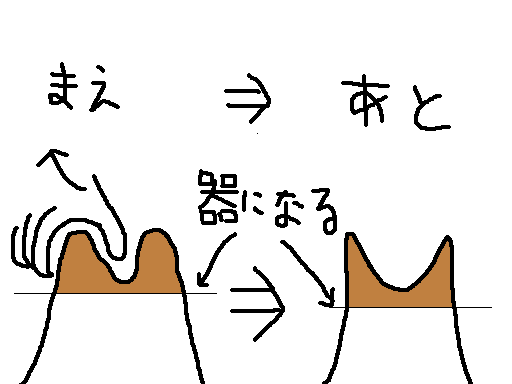 02.形作る前に整えよう 皿、コップなどいろいろな形に変形させる前に、もう1工程。 穴のそこから口のほうに行くにつれて、少しずつ薄くなるようにまっすぐ伸ばしていきます。親指を穴の中、他の4本は外から土を挟むようにしてゆっくり上に伸ばしていきましょう。 全般的に言える事だけど、手は基本的に下から上へ、ゆっくり土と離れるまで速度は一定に。これとても大切です。 手がブレ無いように気をつける事も大切です。背の高い人はヒジをモモの上において安定させるとやりやすいみたいです。 注3<なぜ下のほうを太く上を薄くするかというと、後々延ばしたときにヘニャっっと萎れてしまわないようにするためです> |