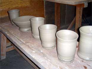 03.好きな形にしよう ・土の水分に気を配りながら右手を内側。左手を外側にして中指がしっかりくっつくように意識しながら伸ばしていきます。 これも先ほどと同様、あまり底のほうが薄くなると倒れてしまいます。 なるべく均等の厚さになるように斜めに延ばしていきましょう。(左図) ・ビールジョッキのようにまっすぐな物を作りたい時は、上の作業をしてから両手の平で押さえるようにしてそのまままっすぐ上へ動かしていくと出来ます。 ・この二つを基本的に繰り返して、高さと形を決めていきます。 注4<あまり口のほうを細くしすぎないようにしましょう、完成して使っているうちにかけて口が血だらけになります。> |